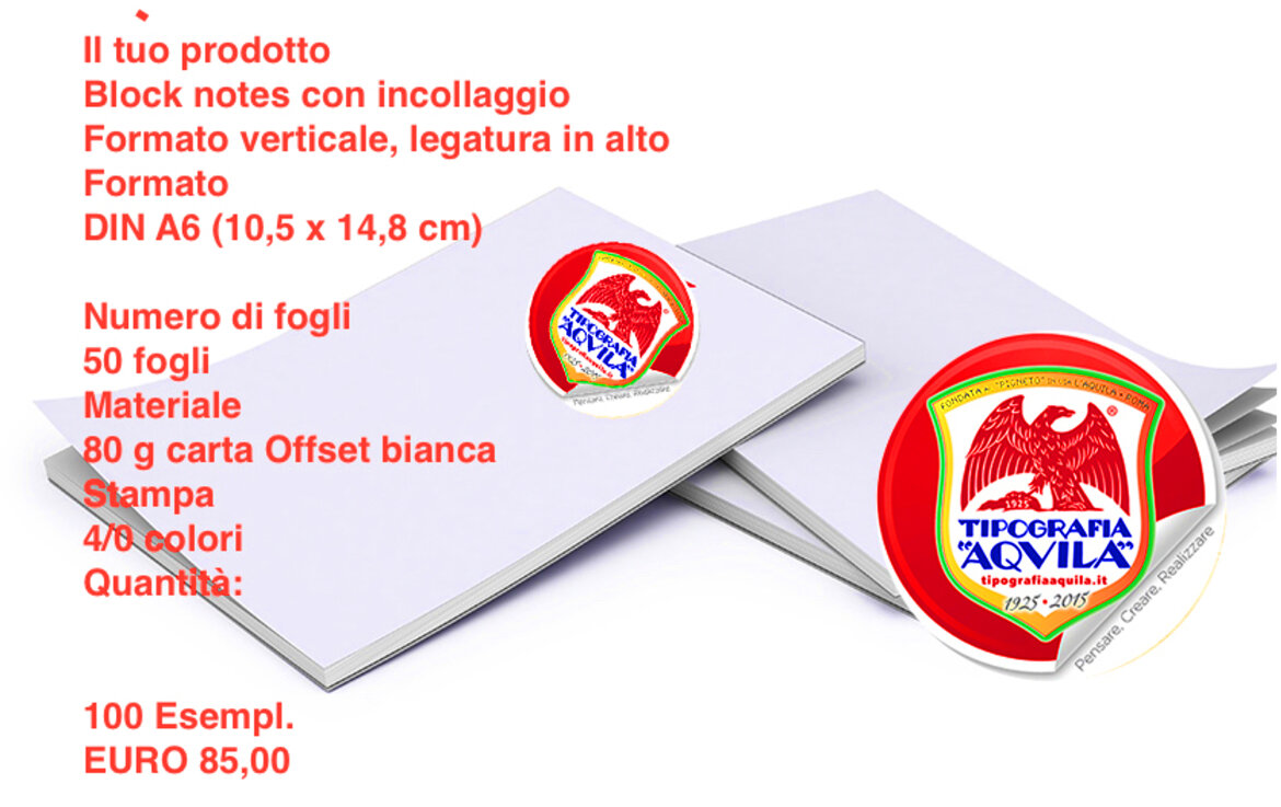 100 Blocchi Appunti in stampa Full Color, allestiti da 50ff Formato A5 ad Euro 85,00